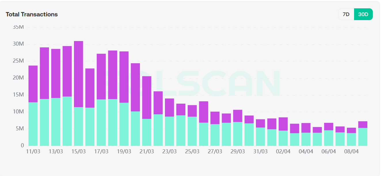 链上投资者主要在solana上进行交易,通过区块浏览器可以看到,solana上的活跃用户和总交易在这周均扭转了自3月以来的下降趋势,活跃用户上升50%,再次逼近100w账户活跃;总交易数上升35%,预示链上行情可能接近反转。