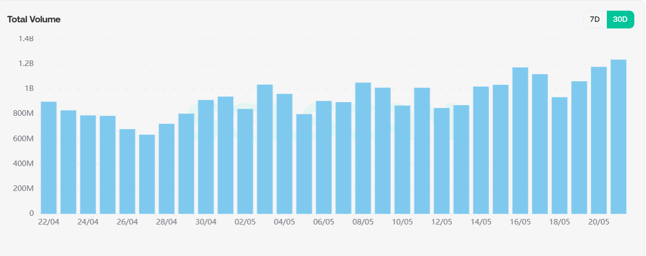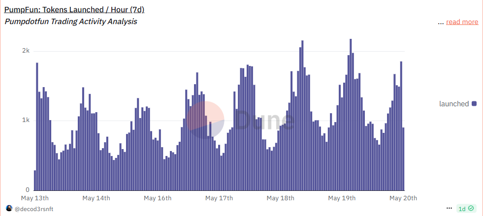 从pump.fun数据可以看到,总交易额依旧呈现上升趋势,活跃账户总体保持在150K,说明meme投资者依旧保持活跃。总交易哈希数保持上升趋势,在上周believe,bonk,pump.fun三大发射台混战后(详见5月16日周报分析),pump.fun交易活跃度回暖。