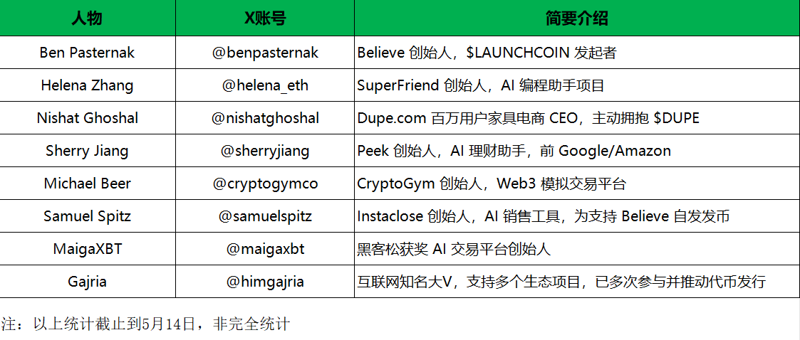 1.Believe平台吸引来自Web2和AI领域知名创业者与Web3项目参与,发行代币,涵盖AI、消费、金融等诸多领域。