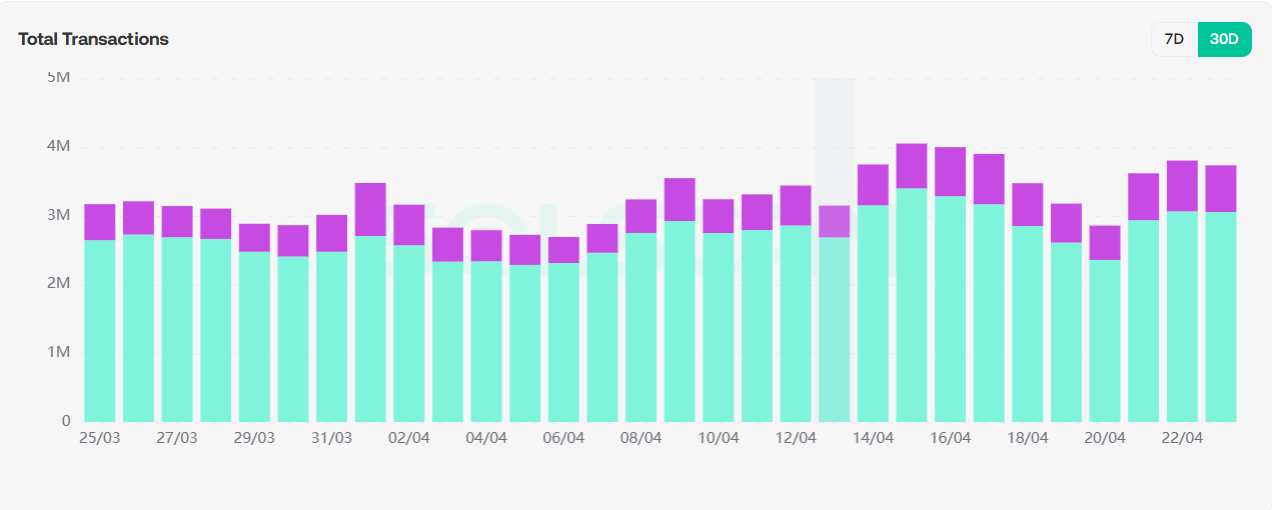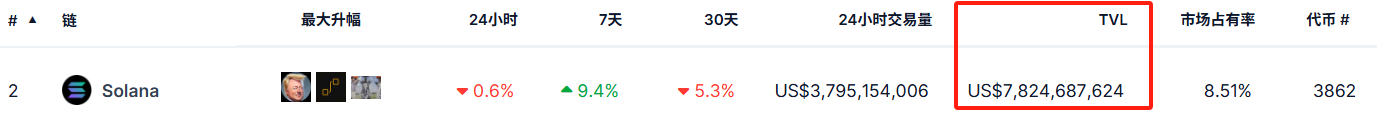 可以看到solana链上Defi协议交易哈希在本周较上周基本保持持平;但值得关注的是总交易量较上周迎来巨幅提升,总额已经达到9B左右,较上周提升超过50%,虽然Defi协议笔数未增加,从交易额上可以看到投资者们对solana后市行情看好,在sol生态也投入了更多资金。