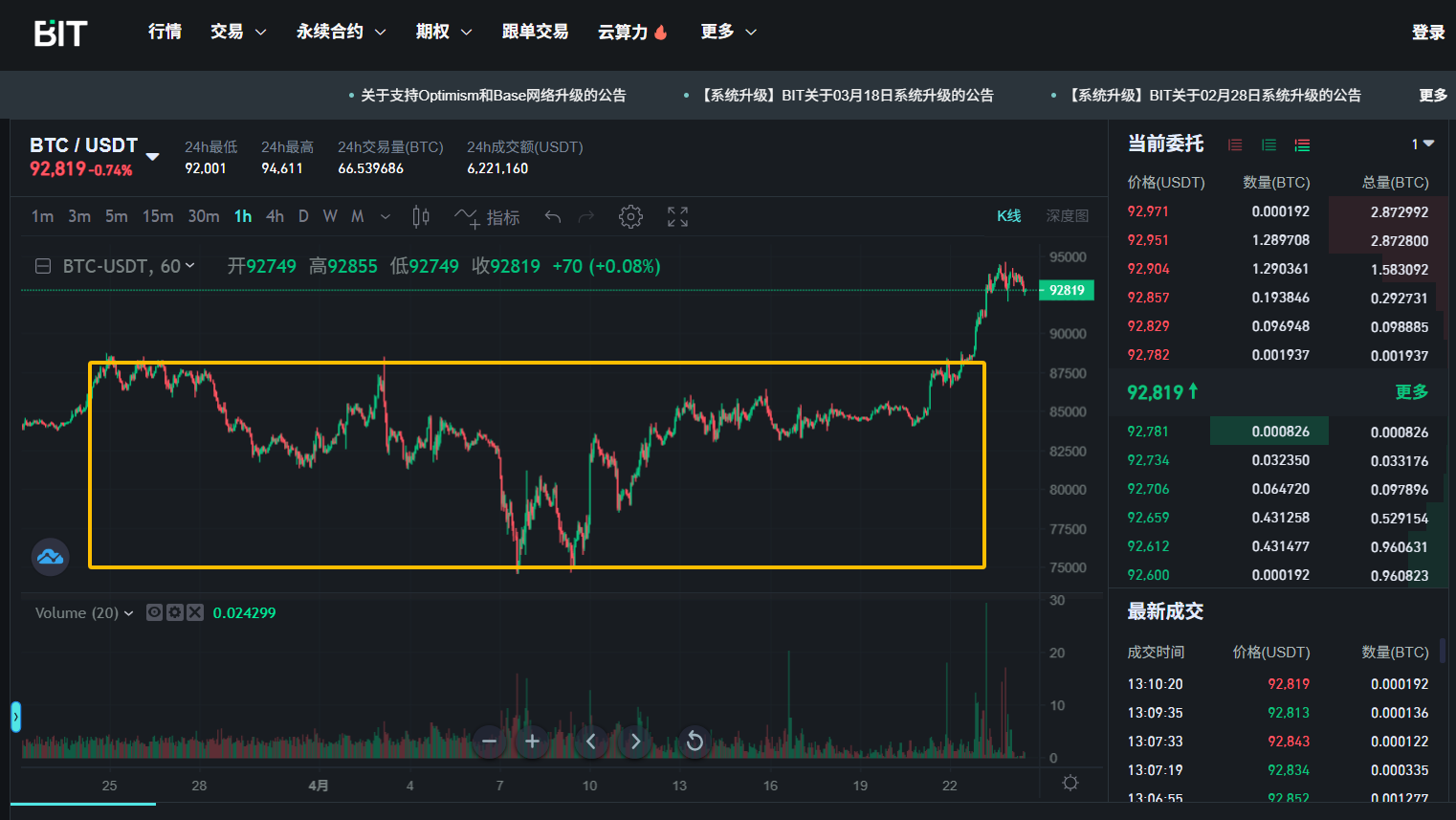 当晚,比特币价格直接从8万6千美金直接跳至9万4千美金左右,成功完成突破,而对于特朗普是否会在之后出尔反尔,当下市场并不关心。对后市而言,暂无助力比特币重回10万美金的利好消息,对比特币价格后市依旧判断为在9万美金到9万5千美金左右震荡,在5月份迎来爆发。