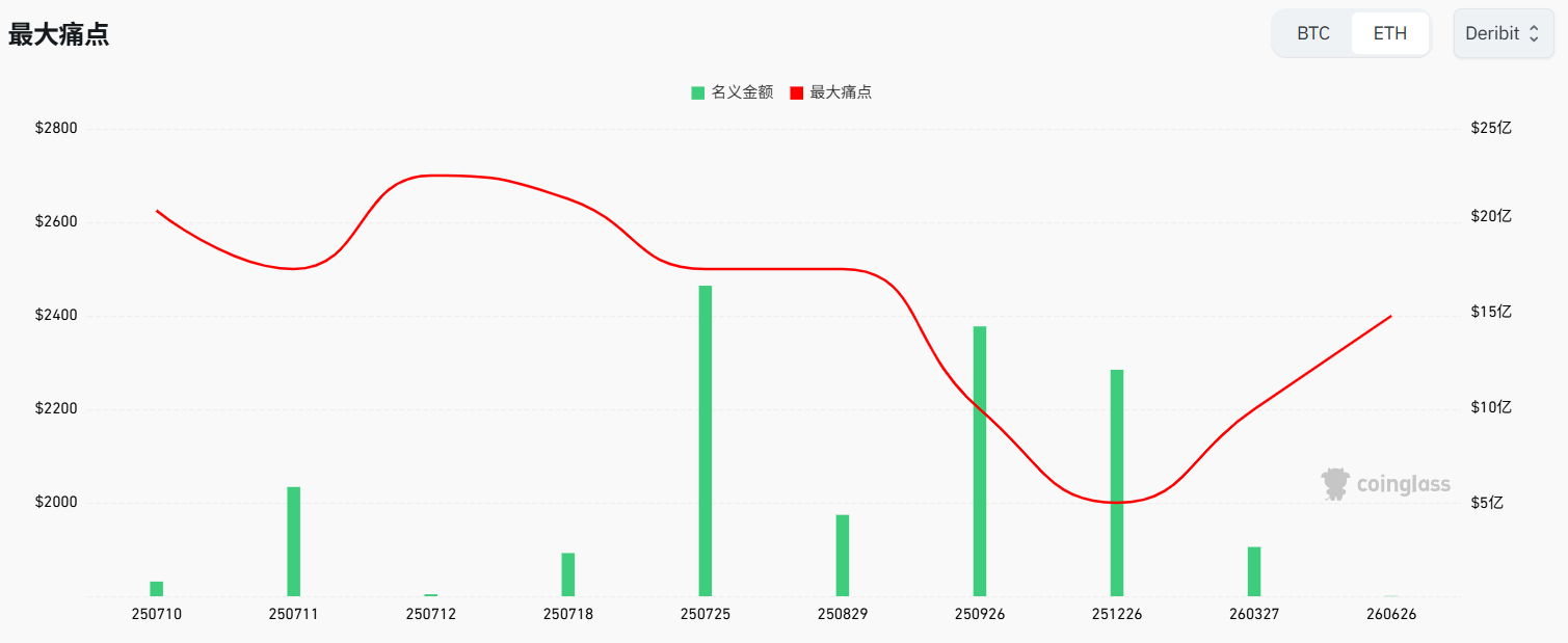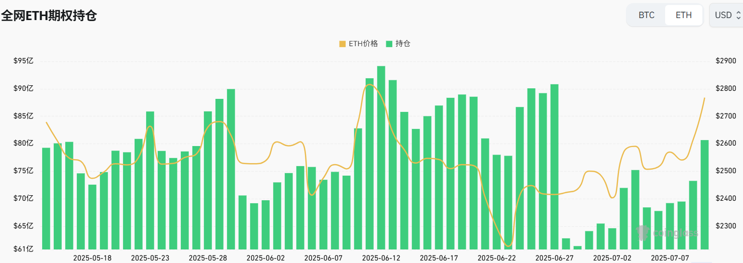 从期权持仓量可以观察到在本周以太坊期权持仓量呈现指数型增加,7月8日-10日新建较多头寸,新建头寸价格在2650美金至2700美金左右