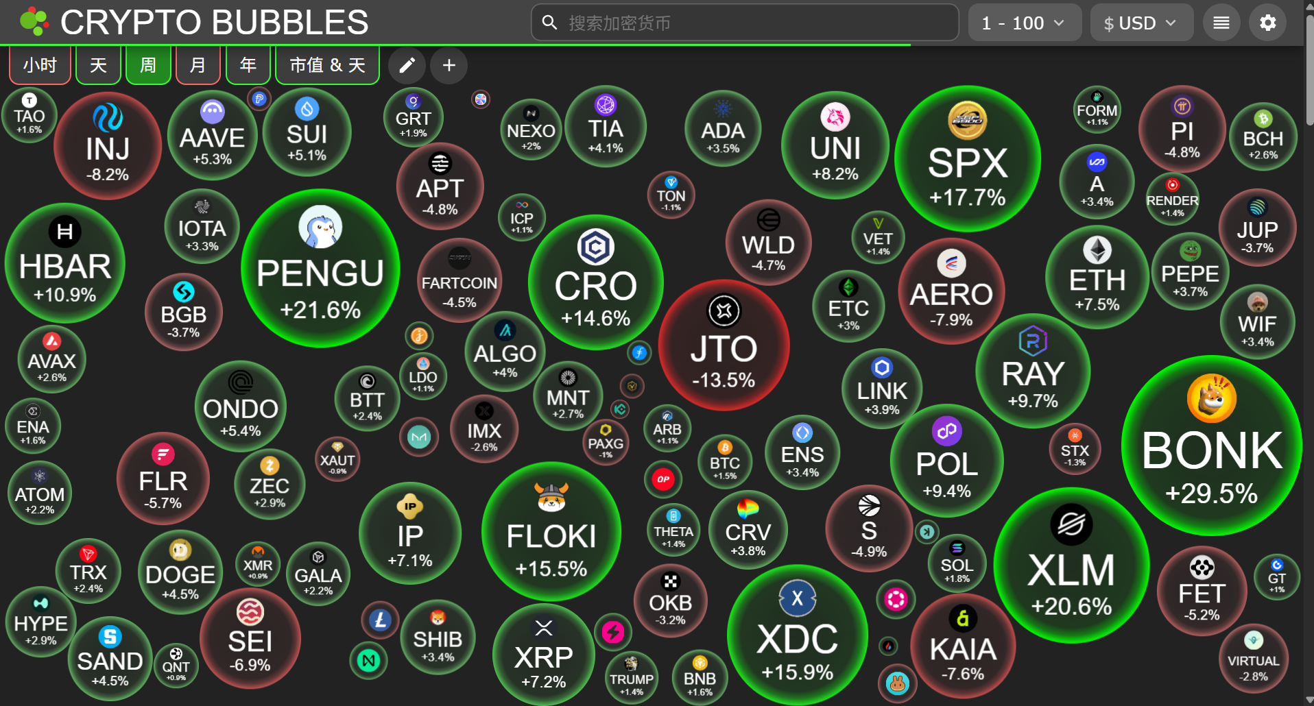 加密市场排名前100代币中在本周呈现反弹,BONK代币表现亮眼,涨幅接近30%。得益于其链上meme发射台Letsbonk在本周引起投资者广泛关注,详细可见链上数据分析SOL生态中meme生态部分。