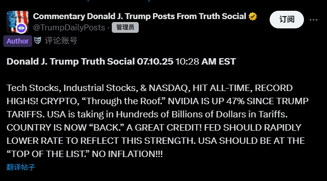 市场随即应声上涨,1h内比特币价格从10万9千5百美金上涨至11万1千9百美金,触及历史新高。随后7月10日晚,特朗普在社交平台发文:科技股、工业股和纳斯达克指数创历史新高!加密货币“火爆”。自特朗普加征关税以来,英伟达股价上涨了47%。美国正承受着数千亿美元的关税。这个国家现在“回归”了。功不可没!美联储应该迅速降息以反映这种强劲势头。美国应该位居“榜首”。没有通货膨胀!!!