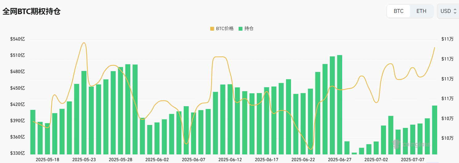 从期权持仓量可以观察到在本周比特币期权持仓量呈现上升趋势,从35B上升至42B,新建头寸价格大约在10万8千美金至11万美金左右