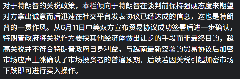 本栏认为:关税政策的确定性逐渐增强,7月11日新高已充分释放了特朗普政府与日韩、巴西等国实现协议的预期,依据为对特朗普过去先严词威胁以或许他国妥协,由于特朗普多次表现希望降息的需求,高关税带来的高通胀不符合特朗普政府的利益,所以达成协议是必然的。而在未来三周与各国的协议将成为市场的主要矛盾,即将到来的每一次协议的确定都是对预期的释放,所以对后市本栏认为市场会随时面临投资者获利了结从而进行回调;从降息角度出发,由于关税延迟至8月1日,7月的通胀数据大概率是温和上升的,不具备超预期上升的条件。在下周美国即将公布CPI、PPI等至关重要的经济数据,当下市场普遍对经济数据保持乐观,尽管比特币仍可能继续上行,本栏仍认为当下市场再无流动性支撑的情况下面临随时回调的风险,建议投资者可进行小仓位获利了结,不建议盲目追高。对于比特币长期投资者来说可继续币本位,若回调也可买入。
