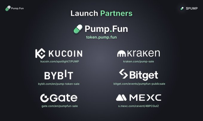 详情:pumpfun即将于7.12日 22:00开始公售,届时可通过KUCOIN、Kraken、Bybit、Bitget、Gate、MEXC六家交易所进行,附链接: