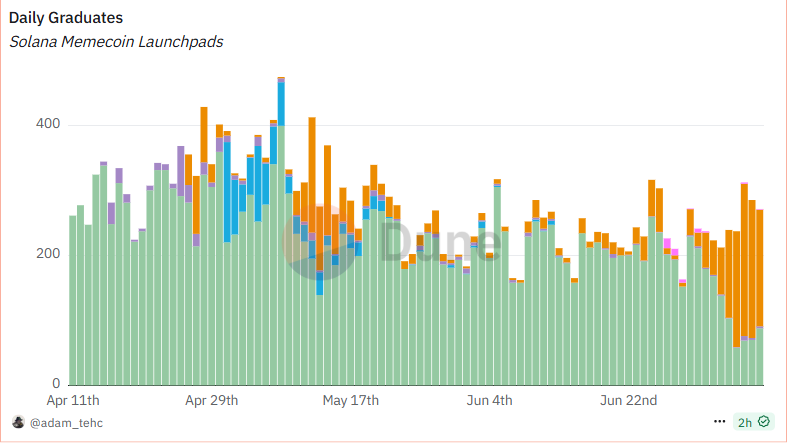 从meme发射台数据可以看到,从本周7月1日起,SOLmeme生态代币部署逐渐从pumpfun转移至Letsbonk:7月1日,Letsbonk上代币部署量为2048枚,毕业代币仅21枚,市场份额为8.7%;一周时间内,代币部署量已增加至22309枚,毕业代币增加至200枚,市场份额增加至74.4%。与此同时pumpfun代币部署量从27544下降至8657枚,毕业代币从211枚下降至最低58枚,市场份额从87%锐减至最低24%。
