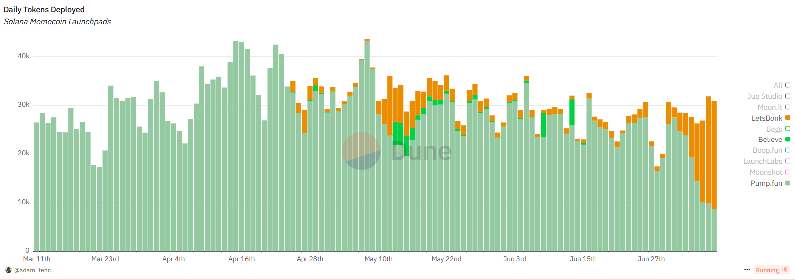 (图表来源于dune,橙色代表Letsbonk,绿色代表pumpfun)