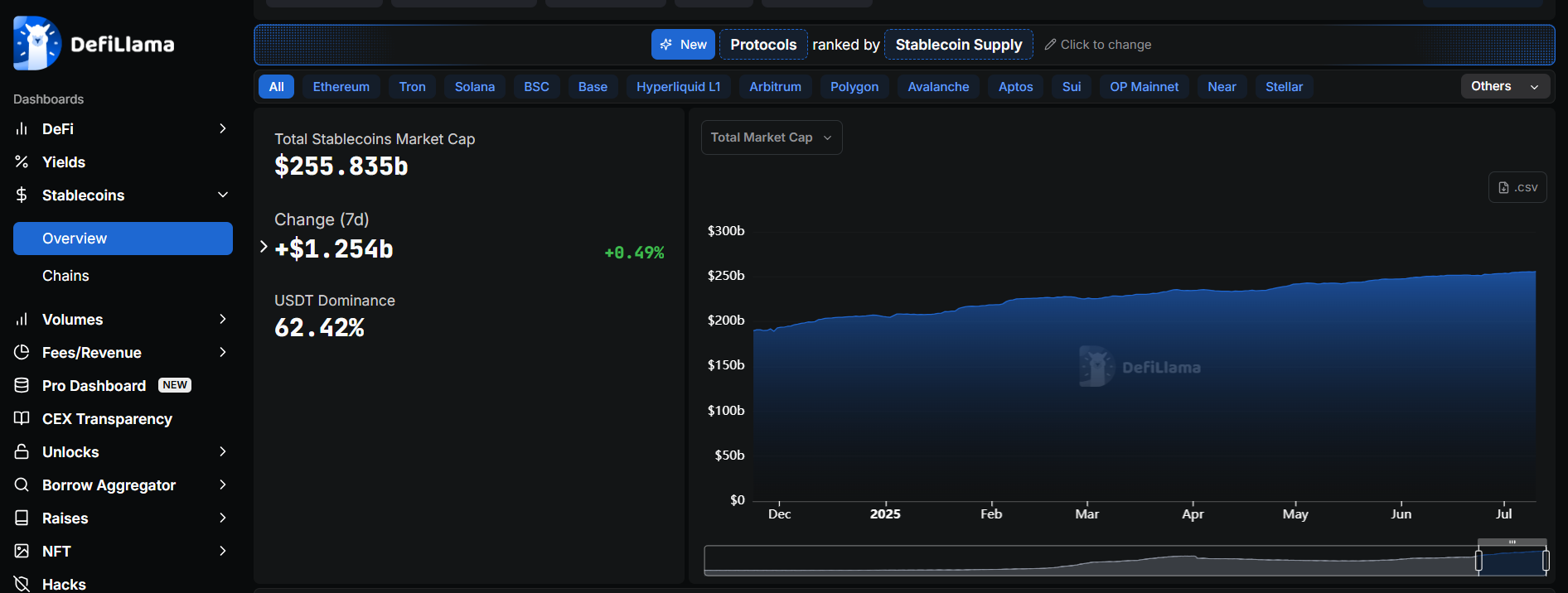 本周稳定币增加1.254B,总市值目前为255.835B。