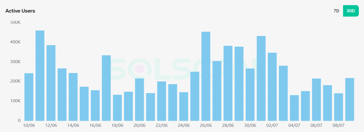 从DeFi协议数据可以观察到,总质押量在本周呈现下降趋势趋势,从7月2日14.28B下降至当前12B;日均活跃人数维持在180K;较上周300K有明显下降,说明在上周SOLETF宣布即将推出后,部分投资者在本周出现分歧,选择退出质押。